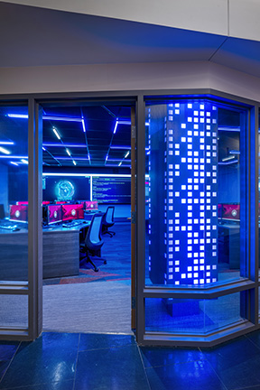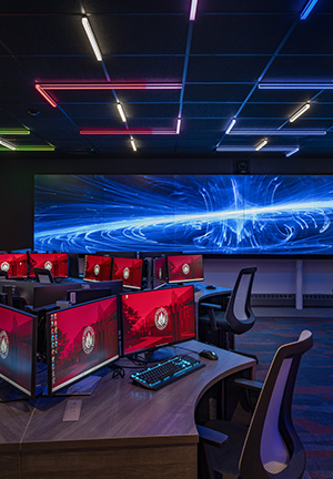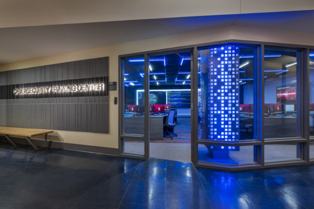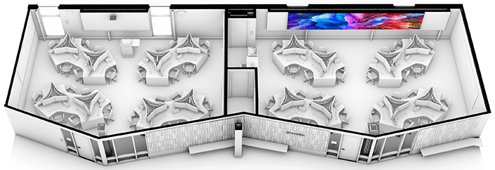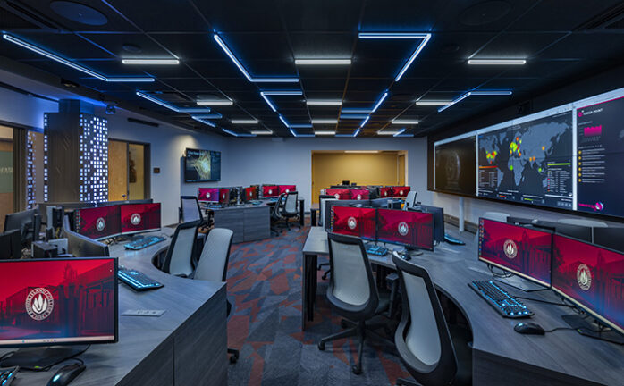 LLB Architects renovated two classrooms in Alger Hall for the Institute for Cybersecurity and Emerging Technologies (ICET). Our challenge was working within the tight footprint and low floor-to-floor heights while providing good sight lines to a 24' video wall. The compressed space meant that a standard front-facing desk layout would not work. Instead, we arranged irregularly shaped pods and large wall monitors around the room in a multi-directional layout. This configuration fosters group work and allows faculty to circulate freely and interact with students. The ICET instructors deemed this innovative solution a significant improvement over the initially intended standard layout.